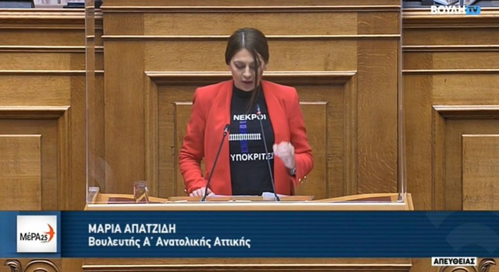 Μάλιστα, πριν ανέβει στο βήμα της βουλής η Μαρία Απατζίδη είχε κλειστό το κόκκινο σακάκι της και στη συνέχεια το άνοιξε για να φανεί το μήνυμα στην μπλούζα της.