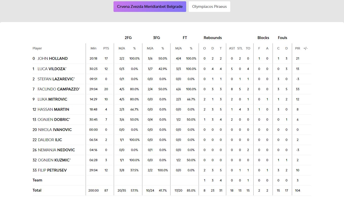Ο Ολυμπιακός γνώρισε την ήττα στο Βελιγράδι από τον Ερυθρό Αστέρα με 87-79 και δεν κατάφερε να «κλειδώσει» από απόψε την πρωτιά της κανονικής περιόδου της Euroleague. Οι «ερυθρόλευκοι» θα έχουν την ευκαιρία ωστόσο να τερματίσουν πρώτοι με νίκη απέναντι στην Μπασκόνια την τελευταία αγωνιστική.