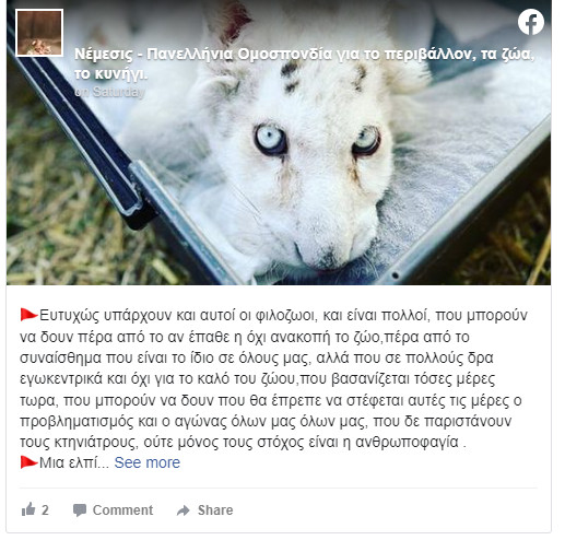 Μάλιστα, στη «Νέμεσις – Πανελλήνια Ομοσπονδία για το περιβάλλον, τα ζώα, το κυνήγι» έφτασε μια συγκινητική επιστολή για τη μικρή λευκή τίγρη με την Ομοσπονδία να την αναδημοσιεύει αυτούσια στο Facebook.
