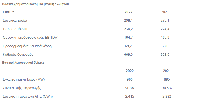 Τα έσοδα του Ομίλου, χάρη στην υψηλότερη παραγωγή των μονάδων ΑΠΕ, αυξήθηκαν σε 298 εκατ. ευρώ έναντι 273,1 εκατ. ευρώ το 2021, και οδήγησαν την προσαρμοσμένη λειτουργική κερδοφορία από συνεχιζόμενες δραστηριότητες (adj. EBITDA) στα 164,7 εκατ. ευρώ (+3,0% y-o-y) και τα προσαρμοσμένα καθαρά κέρδη (adj. net profit) στα 69,7 εκατ. ευρώ (+2,5% y-o-y).