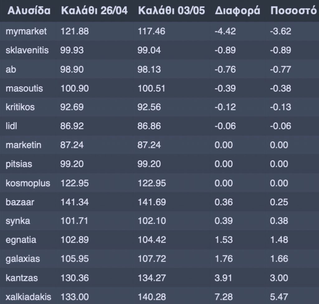 Αναλυτικά στον πίνακα που επισυνάπτεται το κόστος του «Καλαθιού του Νοικοκυριού» ανά σούπερ μάρκετ και η μεταβολή του από την 26η στην 27η εβδομάδα.