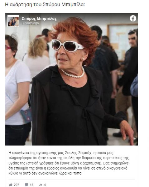 «Η οικογένεια της αγαπημένης μας Σούλης Σαμπάχ, η οποία μας πληροφόρησε ότι ήταν κοντά της σε όλη την διάρκεια της περιπέτειας της υγείας της (επειδή γράφηκε ότι έφυγε μόνη κ ξεχασμένη), μας ενημερώνει ότι επιθυμία της είναι η εξόδιος ακολουθία να γίνει σε στενό οικογενειακό κύκλο γι αυτό δεν ανακοινώνει ώρα και τόπο» έγραψε ο Σπύρος Μπιμπίλας.