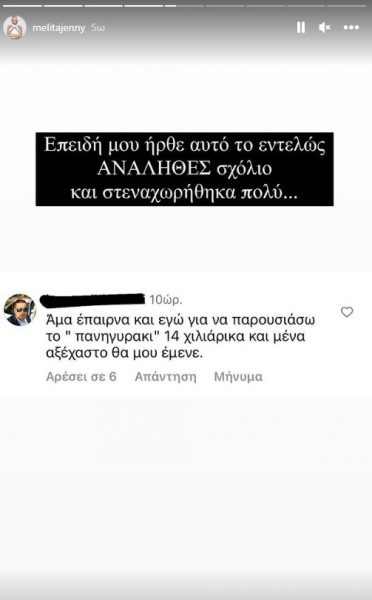 «Άμα έπαιρνα κι εγώ για να παρουσιάσω το «πανηγυράκι» 14 χιλιάρικα και εμένα αξέχαστο θα μου έμενε», ήταν ένα από τα σχόλια που δέχτηκε η Τζένη Μελιτά, η οποία απάντησε: