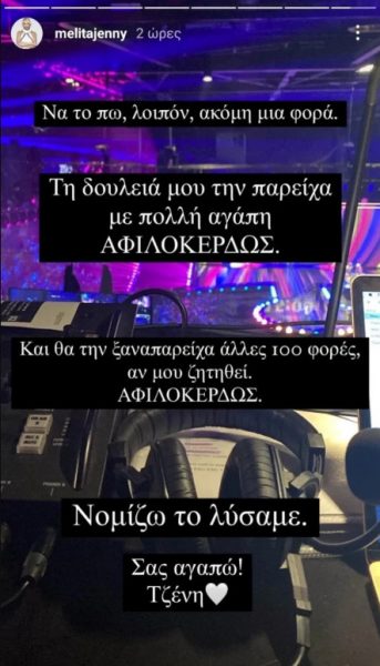 «Επειδή μου ήρθε αυτό το εντελώς αναληθές σχόλιο και στεναχωρήθηκα πολύ. Να το πω λοιπόν ακόμα μια φορά. Τη δουλειά μου την παρείχα με πολλή αγάπη αφιλοκερδώς. Και θα την ξαναπαρείχα άλλες 100 φορές αν μου ζητηθεί. Αφιλοκερδώς. Νομίζω το λύσαμε. Σας αγαπώ, Τζένη».