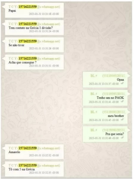 Στα μηνύματα που αντάλλαξαν μεταξύ τους στις 31 Ιανουαρίου 2023 και είδαν το φως της δημοσιότητας ο Τιάγκο ρωτά τον Μπρούνο Λόπες αν γνωρίζει παίκτες στην πρώτη κατηγορία της Ελλάδας.