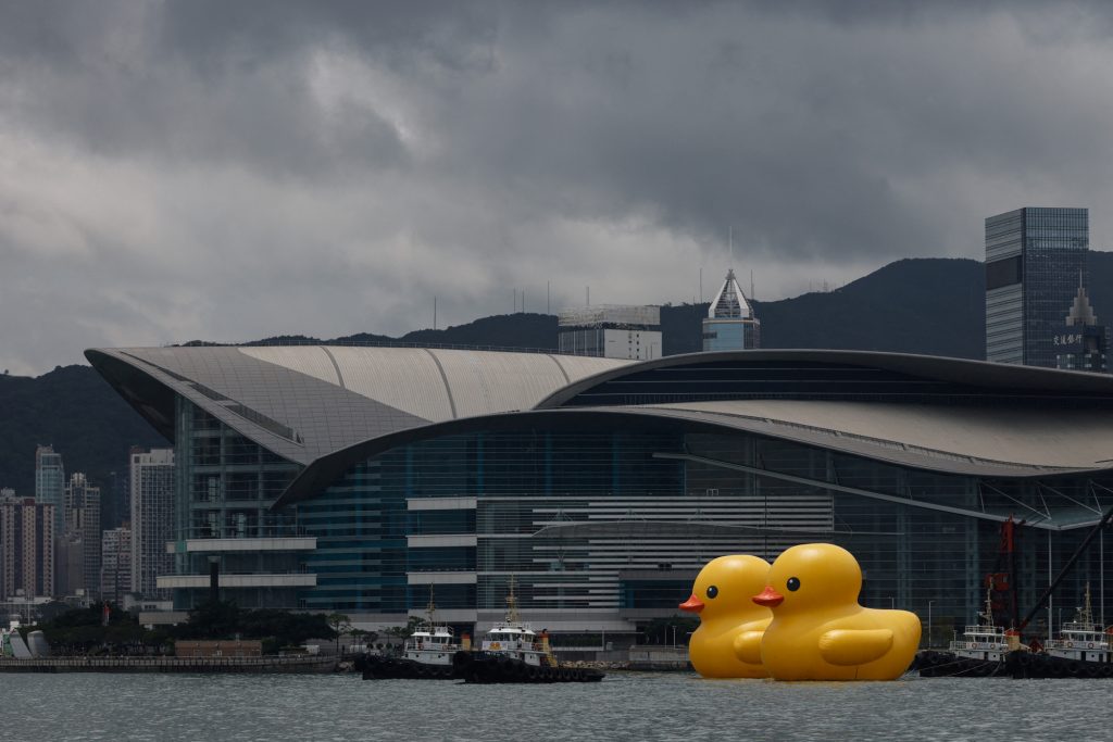 Δέκα χρόνια από την πρώτη εμφάνιση στο λιμάνι της Βικτόρια στο Χονγκ Κονγκ, το πελώριο παπάκι του Ολλανδού καλλιτέχνη Florentijn Hofman, επέστρεψε στα νερά του Τσινγκ Γι, και μάλιστα με… παρέα. Σύμφωνα με το CNN, τα Rubber Ducks, έχουν ύψος 18 μέτρων, δηλαδή είναι ελαφρώς μεγαλύτερα από εκείνο που είχε εμφανιστεί για πρώτη φορά στο Χονγκ Κονγκ.