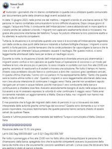Με ανάρτησή της στο Facebook η ακτιβίστρια Nawal Soufi, η οποία ήταν η πρώτη που επικοινώνησε με τους επιβάτες του πλοίου όπως αναφέρει το Alarm Phone, εξουσιοδοτεί τους δημοσιογράφους να μεταδώσουν τη μαρτυρία της από την επικοινωνία που είχε με τους πρόσφυγες τις κρίσιμες ώρες πριν από το ναυάγιο.