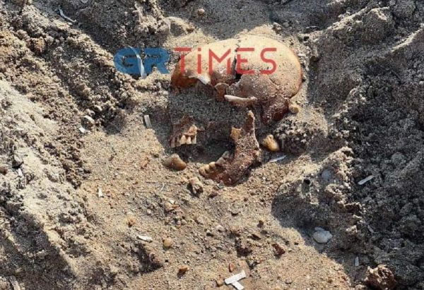 Μάλιστα όπως φαίνεται στις φωτογραφίες του GRTimes, τα οστά και το κρανίο ήταν καλυμμένα από την άμμο.