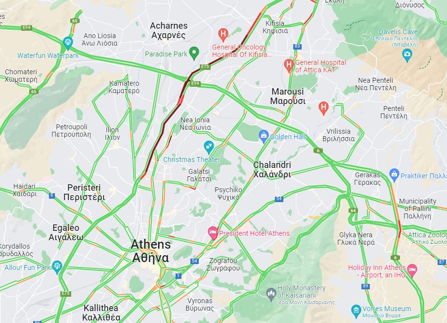 10΄-15΄ από κόμβο Κάντζας έως κόμβο Μαραθώνος.