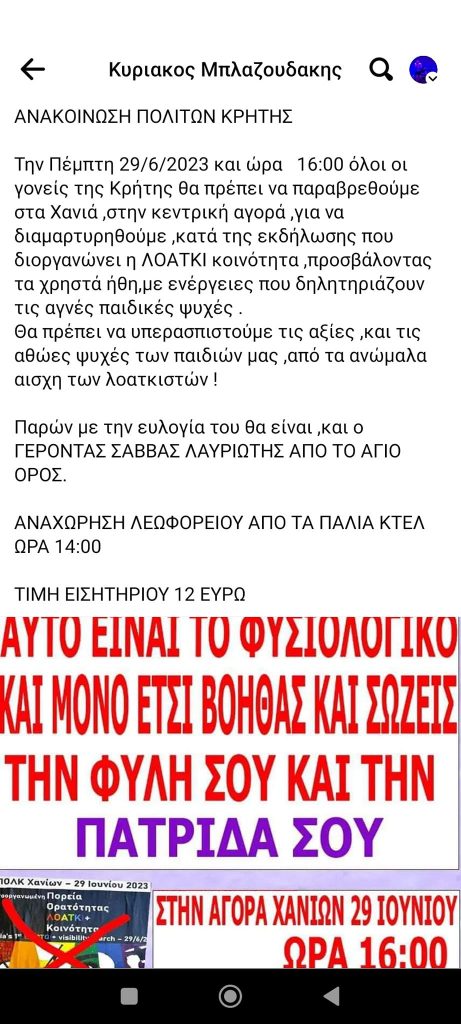Να εκμεταλλευτούν το εκλογικό αποτέλεσμα της 25ης Ιουνίου επιχειρούν οι Σπαρτιάτες, που αν και πήραν από τα μικρότερα ποσοστά τους στην Κρήτη, καλούν σε ομοφοβική αντιδιαδήλωση μίσους και, μάλιστα, μισθώνουν λεωφορεία από το Ηράκλειο, όπως αναφέρει σε εμετική ανάρτησή του στο Facebook ο υποψήφιος βουλευτής, Κυριάκος Μπλαζουδάκης.
