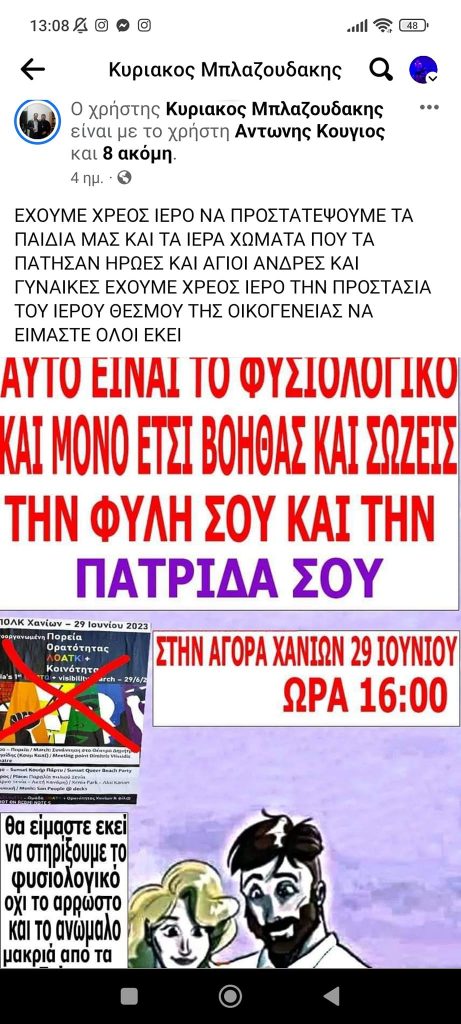 «Λίγες μέρες μετά τις εκλογές οι ‘Σπαρτιάτες’, που στηρίχθηκαν από τον καταδικασμένο για διεύθυνση εγκληματικής οργάνωσης νεοναζί Ηλία Κασιδιάρη, επιχειρούν να εμφανιστούν στους δρόμους με ομοφοβική, ρατσιστική αντιδιαδήλωση ενάντια στην 1η Πορεία Ορατότητας ΛΟΑΤΚΙ+ Κοινότητας (αυτοοργανωμένο pride) Χανίων στις 29/6», τονίζει σε ανακοίνωσή της η Κίνηση Ενωμένη Ενάντια στον Ρατσισμό και τη Φασιστική Απειλή (ΚΕΕΡΦΑ) Χανίων.