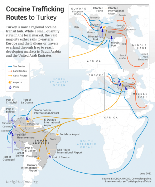 Ο βαθμός εμπλοκής Τουρκίας προέκυψε, σύμφωνα με την έρευνα του Insight Crime, όταν οι παραγωγοί κοκαΐνης της Νότιας Αμερικής χρειάζονταν μια νέα διαδρομή προς τα ανατολικά για το προϊόν τους, καθώς μεγάλο μέρος του κατασχέθηκε προς τη δυτική Ευρώπη. Η Τουρκία ήταν υποδειγματική χώρα για να κάνει την βρωμοδουλειά των ναρκέμπορων.