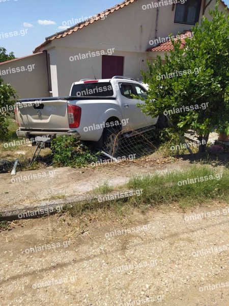 Στο ντοκουμέντο που έφερε στο φως της δημοσιότητας το οnlarissa.gr, διακρίνεται το κλεμμένο λευκό Nissan Navara το οποίο έχει πέσει πάνω σε τοίχο σπιτιού, στο χωριό Μοσχοχώρι, εκεί όπου σταμάτησε η καταδίωξη των αστυνομικών.