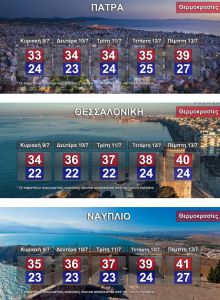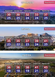 Η θερμοκρασία θα σημειώσει μικρή άνοδο. Θα φτάσει στα ηπειρωτικά τους 37 και κατά τόπους τους 38 βαθμούς και στα νησιά τους 33 με 35 βαθμούς Κελσίου.
