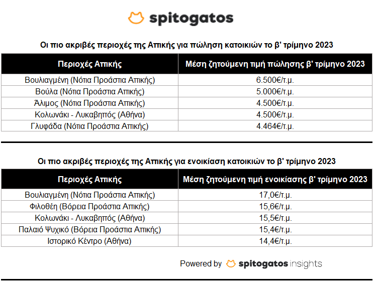Η ανοδική τάση των τιμών ως προς τις κατοικίες που διατίθενται προς πώληση και ενοικίαση συνεχίζεται και το δεύτερο τρίμηνο του 2023, συγκριτικά με το αντίστοιχο διάστημα του 2022. Κάποιες από τις περιοχές που παρουσίασαν τις μεγαλύτερες αυξήσεις στις μέσες ζητούμενες τιμές πώλησης σε σχέση με πέρσι είναι το Ίλιον (Δυτικά Προάστια) με αύξηση +32%, η Αγία Παρασκευή (Βόρεια Προάστια) με αύξηση +27%, η περιοχή Ζωγράφου (Νότια Προάστια) με αύξηση +26% και η Καλλιθέα (Νότια Προάστια) με αύξηση +23%.