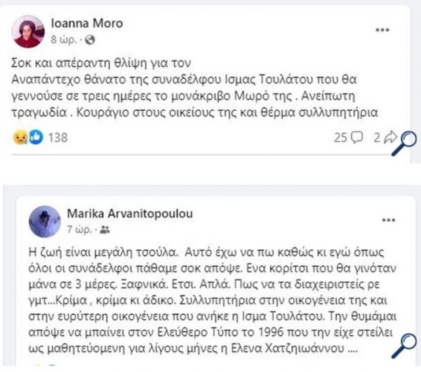 Θρήνος στον δημοσιογραφικό κόσμο, από τον ξαφνικό χαμό της Ίσμας Τουλάτου, η οποία έφυγε από τη ζωή, ενώ σε λίγες ημέρες θα έφερνε στον κόσμο το πρώτο της παιδί.
