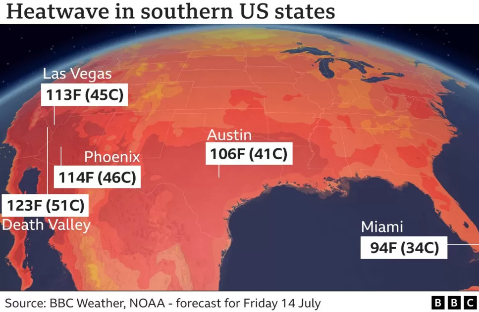 Οι μετεωρολόγοι εκτιμούν ότι το ρεκόρ θερμοκρασίας μπορεί να καταρριφθεί αυτήν την Κυριακή στο Λας Βέγκας της Νεβάδας. Στην Καλιφόρνια, στη διαβόητη «Κοιλάδα του Θανάτου», ένα από τα πιο καυτά μέρη του κόσμου, ο υδράργυρος μπορεί να ανέβει μέχρι και τους 54 βαθμούς Κελσίου.