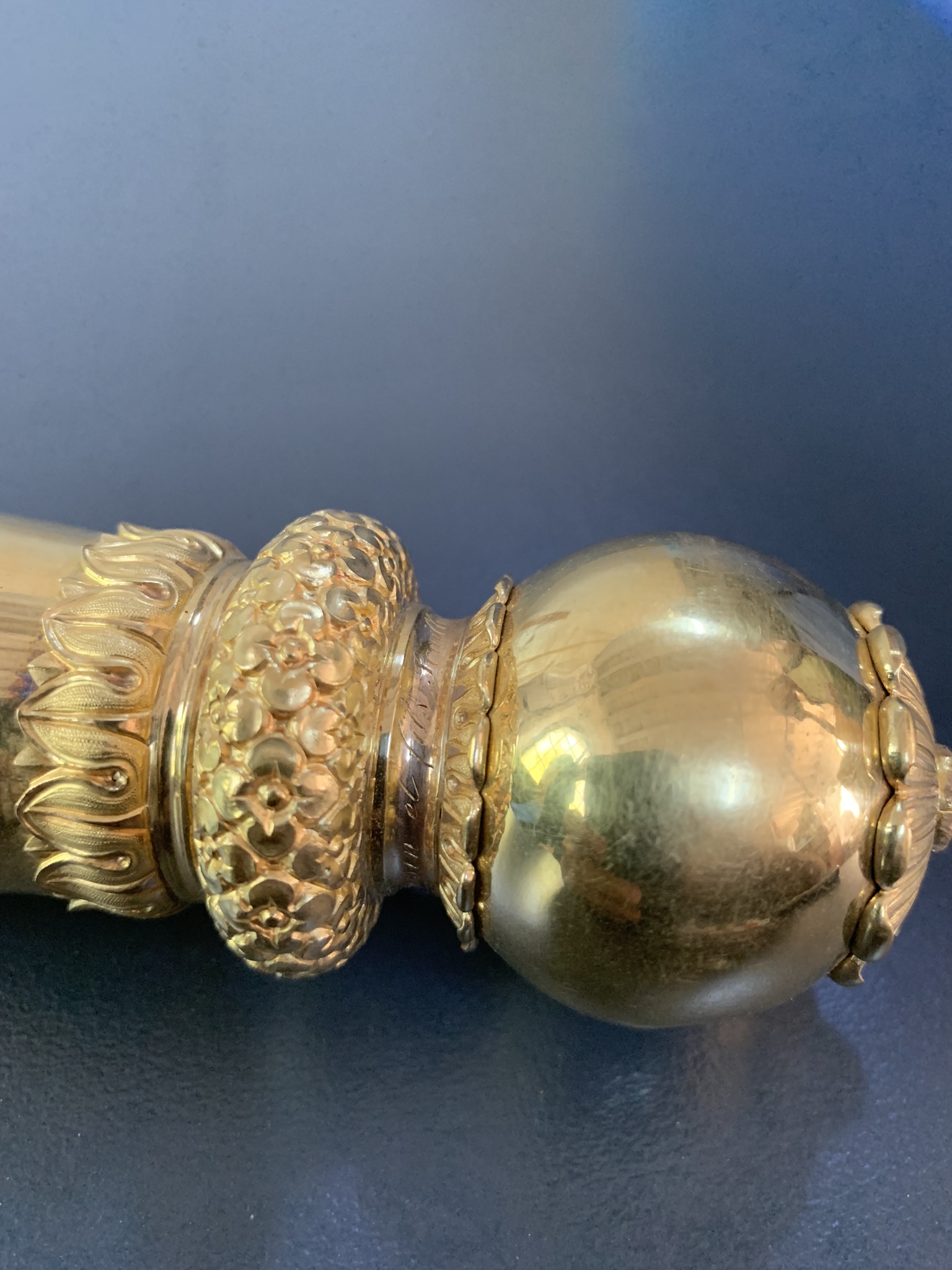 Υλικό: Χρυσός και επιχρυσωμένο μέταλλο, σμάλτο, βελούδο. Διαστάσεις: Ύψος 25 εκ., Μέγ. Διάμετρος 29 εκ.