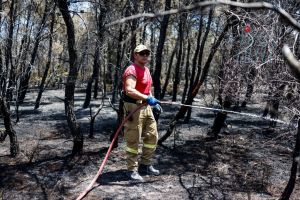 Παράλληλα, ισχυρές δυνάμεις της Πυροσβεστικής, που αποτελούνται από 120 πυροσβέστες με τέσσερις ομάδες πεζοπόρων τμημάτων και 43 οχήματα, έδωσαν ολονύχτια μάχη με τις φλόγες και συνεχίζουν να επιχειρούν, ώστε μαζί με τα εναέρια μέσα να αντιμετωπίσουν άμεσα τις αναζωπυρώσεις που σημειώνονται και να προστατεύσουν κατοικημένες περιοχές. Το έργο τους συνδράμουν μηχανήματα έργων του στρατού και της αυτοδιοίκησης, υδροφόρες, αλλά και εθελοντές.
