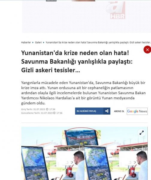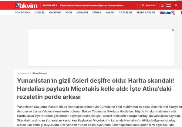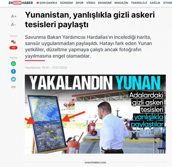 «Η Ελλάδα κατά λάθος δημοσίευσε στρατιωτικές εγκαταστάσεις», αναφέρει δημοσίευμα στον ιστότοπο Εnsonhaber και προσθέτει: «Ο χάρτης που εξέταζε ο υφυπουργός Άμυνας, Χαρδαλιάς δημοσιεύθηκε χωρίς να έχει καλυφθεί. Αναγνωρίζοντας το λάθος, οι ελληνικές Αρχές προσπάθησαν να το διορθώσουν, αλλά δεν μπόρεσαν να αποτρέψουν τη διαρροή της φωτογραφίας».