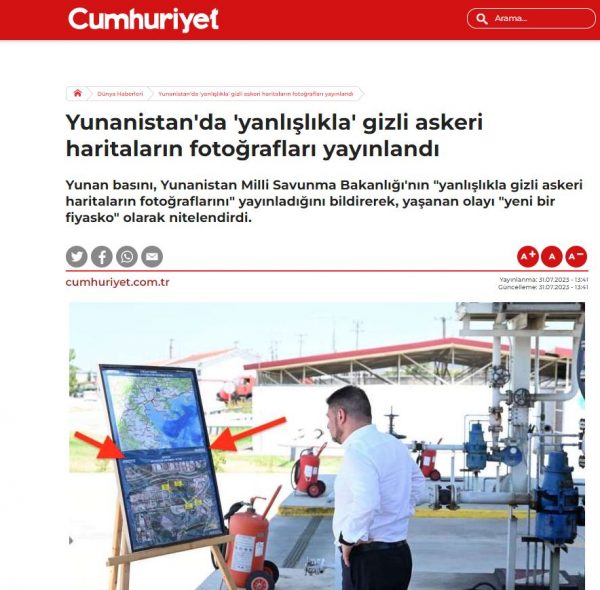 Παρόμοιος τίτλος και για την αντιπολιτευόμενη εφημερίδα Cumhuriyet, «Η Ελλάδα δημοσιεύει ‘κατά λάθος’ φωτογραφίες από μυστικούς στρατιωτικούς χάρτες».