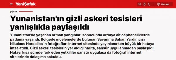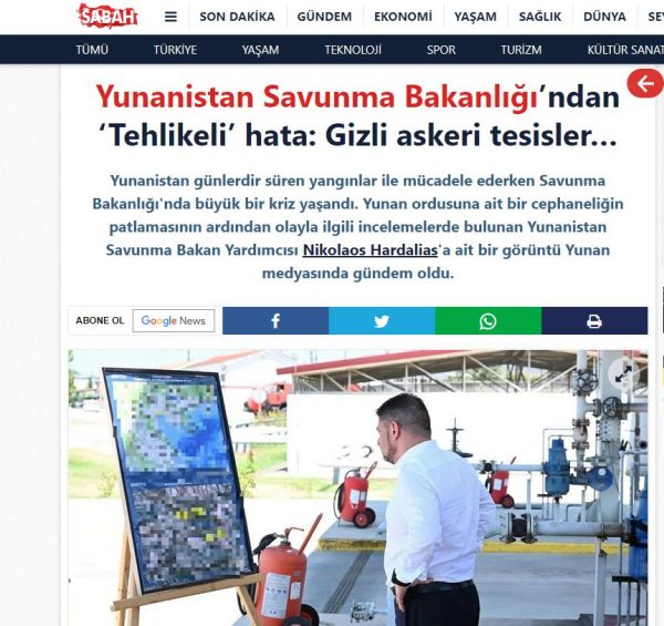 «Από τις δασικές πυρκαγιές στην Ελλάδα υπήρξε έκρηξη σε οπλοστάσιο του στρατού. Ένα μεγάλο λάθος έγινε κατά τη δημοσίευση φωτογραφιών του Νίκου Χαρδαλιά, υφυπουργού Άμυνας, που έκανε επιθεωρήσεις στην περιοχή. Ο χάρτης περιείχε μυστικές στρατιωτικές εγκαταστάσεις χωρίς να έχουν καλυφθεί. Παρόλο που οι Αρχές αναγνώρισαν το λάθος σε σύντομο χρονικό διάστημα και κάλυψαν τον χάρτη, η φωτογραφία δημοσιεύθηκε σε ιστότοπους του διαδικτύου», προσθέτει.