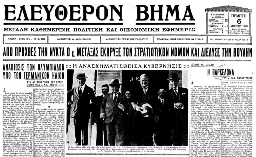 «ΕΛΕΥΘΕΡΟΝ ΒΗΜΑ», 6.8.1936, Ιστορικό Αρχείο «ΤΟ ΒΗΜΑ» | «ΤΑ ΝΕΑ»