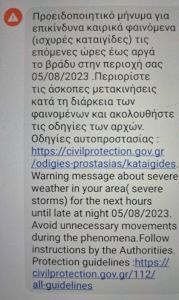 «Προειδοποιητικό μήνυμα για επικίνδυνα καιρικά φαινόμενα (ισχυρές καταιγίδες) τις επόμενες ώρες έως αργά το βράδυ στην περιοχή σας 5/8/2022. Περιορίστε τις άσκοπες μετακινήσεις κατά τη διάρκεια των φαινομένων και ακολουθήστε τις οδηγίες των αρχών» αναφέρει το μήνυμα από το 112 σε Ιωάννινα, Άρτα, Κέρκυρα, Πρέβεζα, Αγρίνιο και Ζάκυνθο.