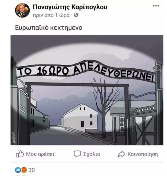 Ειδικότερα, στην ανάρτησή του στο προσωπικό του λογαριασμό Facebook, την οποία και «κατέβασε» μετά από τις αντιδράσεις που προκάλεσε, ο κ. Καρίπογλου παρουσιάζει ένα σκίτσο με την είσοδο του στρατοπέδου Άουσβιτς και την επιγραφή «το 16ωρο απελευθερώνει».