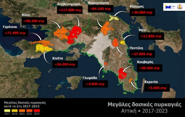 Από το 2017 μέχρι και το τέλος Ιουλίου 2023, 11 μεγάλες πυρκαγιές έχουν κάψει περισσότερα από 550.000 στρέμματα σύμφωνα με τις αναφορές από την Υπηρεσία Ταχείας Χαρτογράφησης Copernicus και το Ευρωπαϊκό Παρατηρητήριο για Δασικές Πυρκαγιές (EFFIS). Η περίμετρος των καμένων εκτάσεων δίνεται στο χάρτη που ακολουθεί.