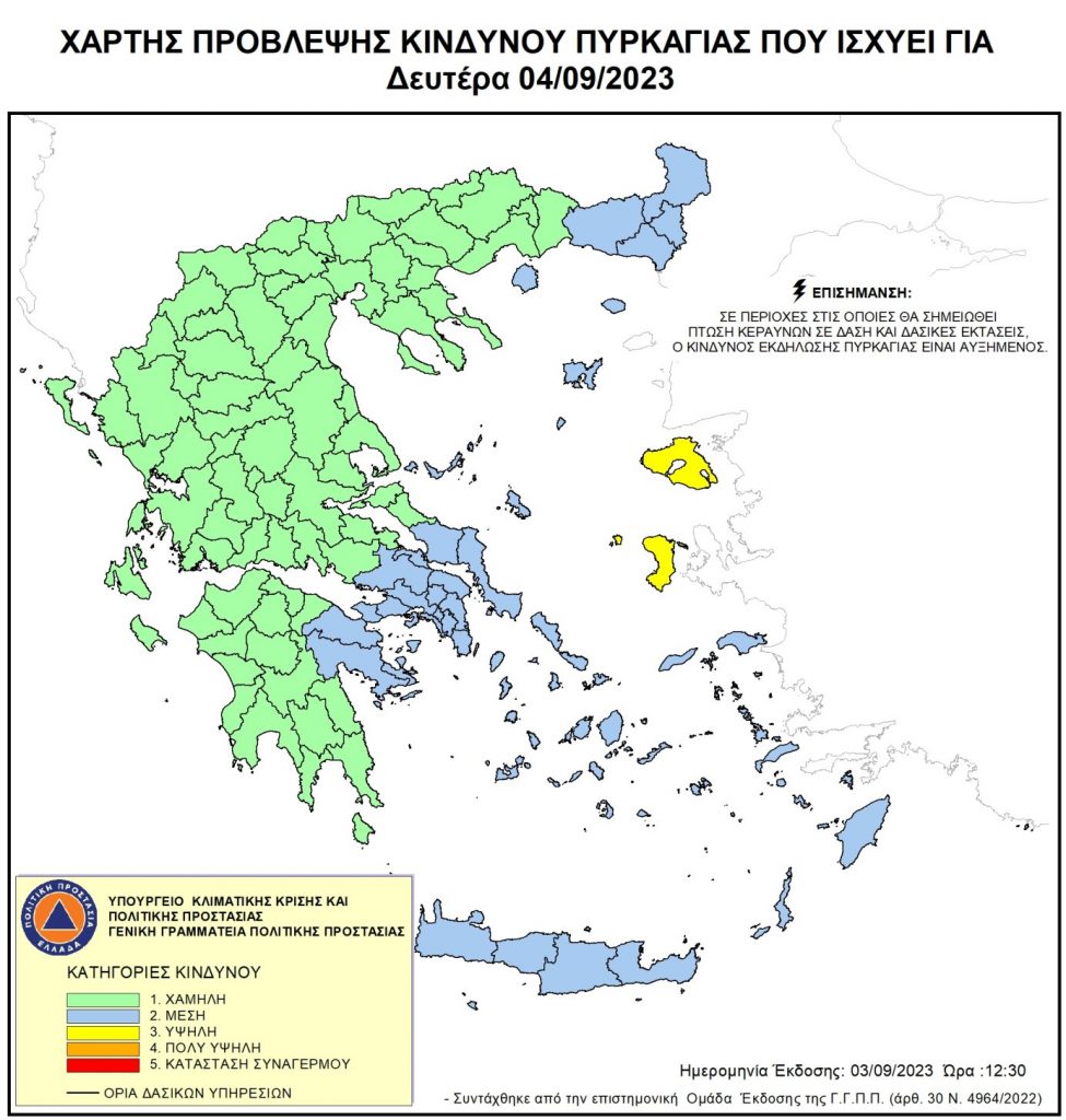 Ειδικότερα, σύμφωνα με το χάρτη πρόβλεψης κινδύνου πυρκαγιάς, που εκδίδει η Γενική Γραμματεία Πολιτικής Προστασίας, προβλέπεται υψηλός κίνδυνος πυρκαγιάς (κατηγορία κινδύνου 3) για: