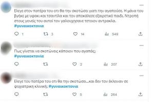 Η νέα γυναικοκτονία έχει προκαλέσει κύμα οργής στα μέσα κοινωνικής δικτύωσης,. «Έλεγε του πατέρα του ότι θα τη σκοτώσει, γιατί δεν τον έκλειναν σε ψυχιατρική κλινική», Λάθος σειρά των γεγονότων! πρώρα έπρεπε να αυτοκτονήσει», «πώς γίνεται να σκοτώνεις κάποιον που αγαπάς» είναι μερικά πολλά σχόλια που έχουν αναρτηθεί.