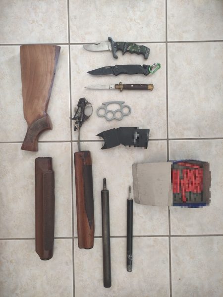 Κοντάκιο κυνηγετικού όπλου, μηχανισμό σκανδάλης πυροβόλου όπλου, χειρολαβές κυνηγετικού όπλου, θαλάμες φυσιγγίων κυνηγετικού όπλου, σιδηρογροθιά, μαχαίρια και σουγιάδες κατάσχεσε το Λιμενικό