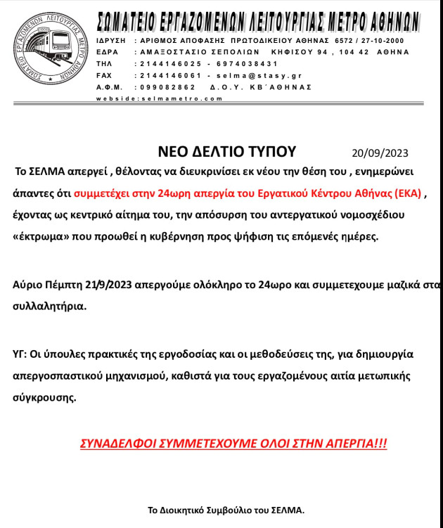 Μετά από όλα αυτά, η ΣΤΑΣΥ με νεότερη ανακοίνωσή της τονίζει ότι: «Σας ενημερώνουμε, πως αύριο Πέμπτη 21/09 δεν θα λειτουργήσουν οι Γραμμές 1, 2 & 3 του Μετρό, λόγω απεργιακών κινητοποιησεων σωματείων εργαζομένων.