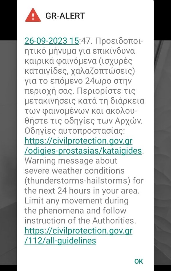 Το μήνυμα στις παραπάνω περιοχές στάλθηκε με βάση τα νέα στοιχεία από το επικαιροποιημένο έκτακτο δελτίο της ΕΜΥ που εκδόθηκε σήμερα στη μία μετά το μεσημέρι.