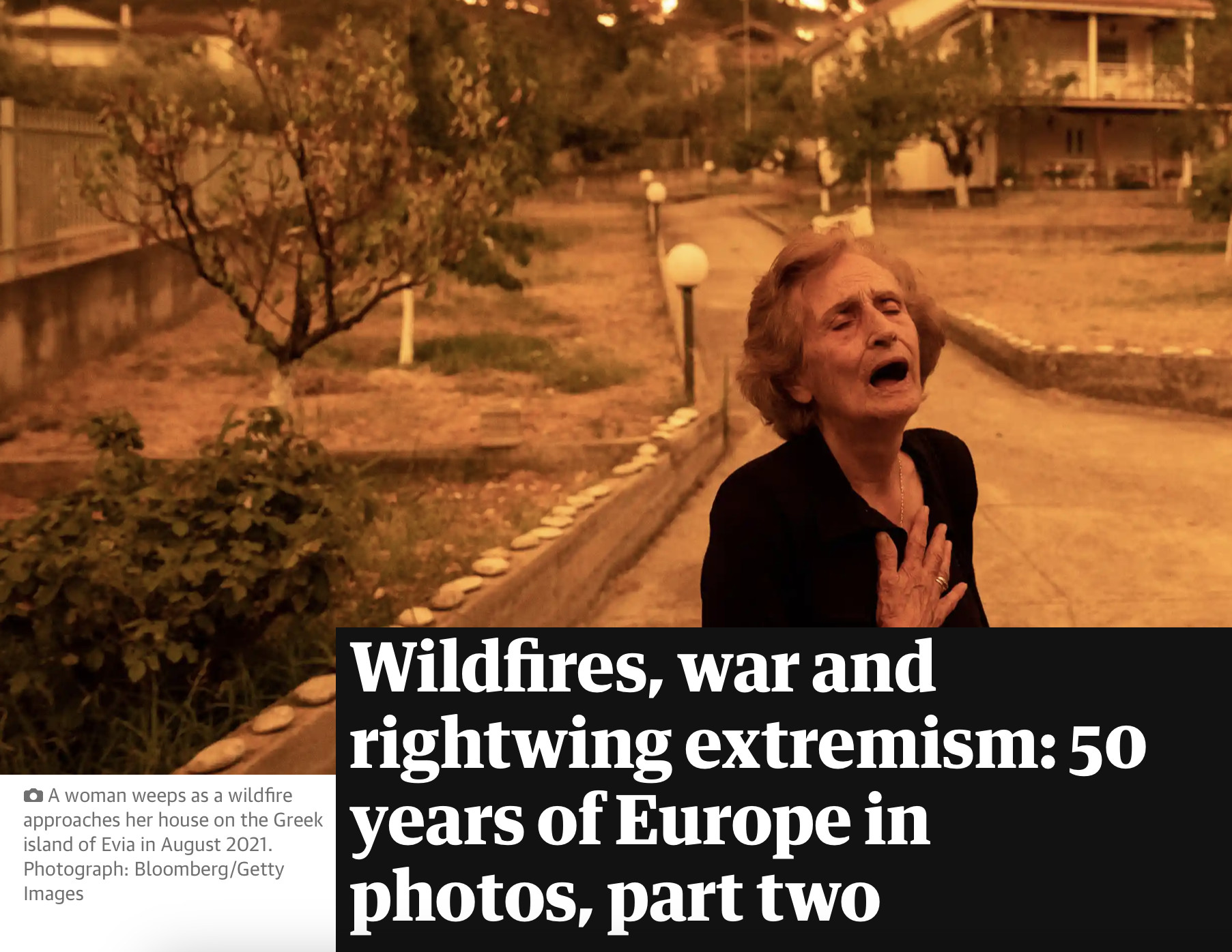 Η φωτογραφία που τράβηξε ο Κωνσταντίνος Τσακαλίδης, που αποτυπώνει την κραυγή μια ηλικιωμένης, της κυρίας Παναγιώτας που έβλεπε τη φωτιά να σαρώνει την Εύβοια, επέλεξε ο Guardian σε ένα μοναδικό αφιέρωμα για τα γεγονότα που καθόρισαν την Ευρώπη τα τελευταία 50 χρόνια.