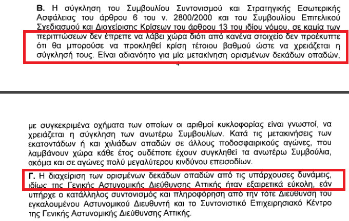 Είναι αδιανόητο (!) για μία μετακίνηση ορισμένων δεκάδων οπαδών με συγκεκριμένα οχήματα των οποίων οι αριθμοί κυκλοφορίας είναι γνωστοί, να χρειάζεται η σύγκληση των εν λόγω συμβουλίων. Η διαχείριση των ορισμένων δεκάδων οπαδών από τις υπάρχουσες δυνάμεις ιδίως της Γενικής Αστυνομικής Διεύθυνσης Αττικής ήταν εξαιρετικά εύκολη εάν υπήρχε ο κατάλληλος συντονισμός και πληροφόρηση από την τότε Διευθυνση του εγκαλούμενου Αστυνομικού Διευθυντή και το Συντονιστικό Επιχειρησιακό Κέντρο της ΓΑΔΑ».