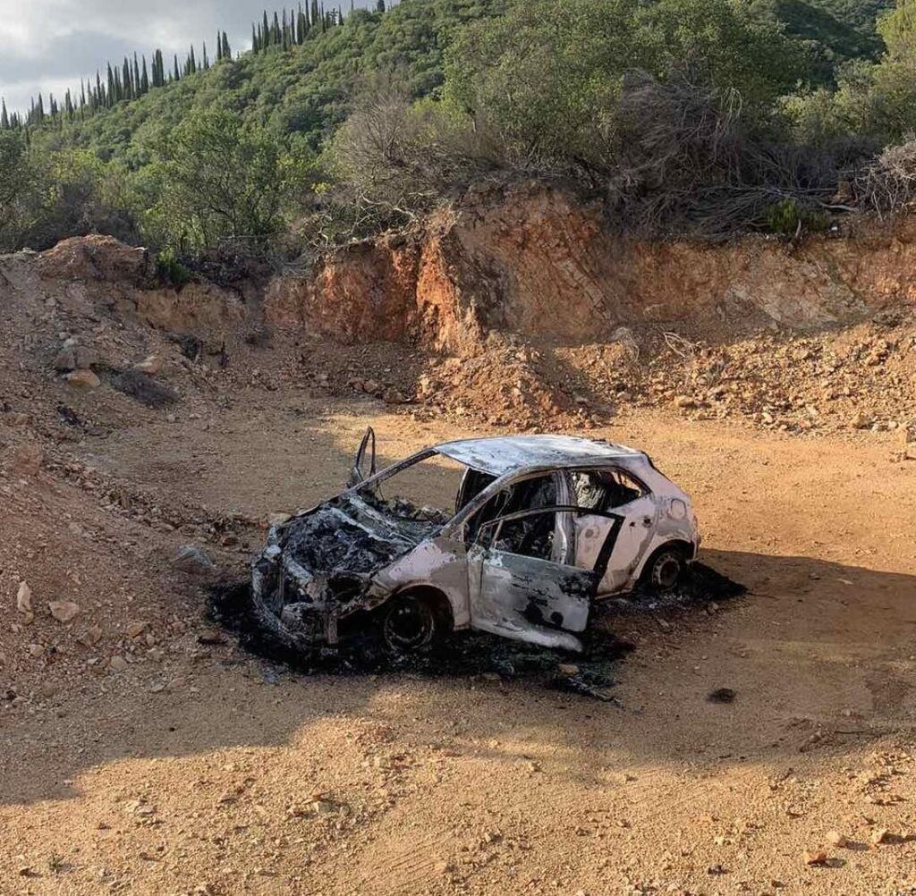 Το καμένο αυτοκίνητο που εκτιμάται ότι χρησιμοποίησαν οι ληστές στο Πεταλίδι Μεσσηνίας.