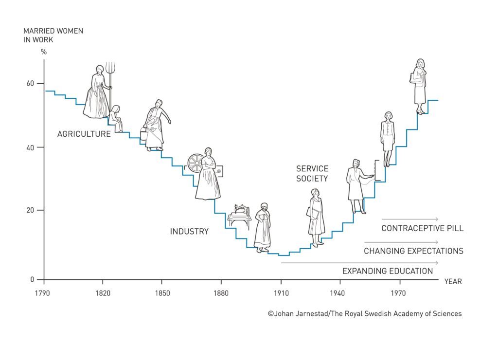 Η Γκόλντιν έδειξε ότι η συμμετοχή των γυναικών στην αγορά εργασίας δεν είχε ανοδική τάση όλη αυτή την περίοδο, αλλά σχηματίζει μια καμπύλη σε σχήμα U.
