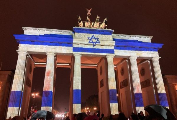 Η Πύλη του Βραδεμβούργου στο Βερολίνο φωταγωγημένη στα χρώματα της σημαίας του Ισραήλ