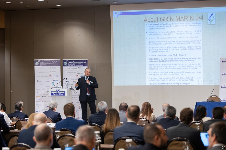 O κ. John Agiomirgiannakis, τόνισε: “Η Tailors Group είναι μια σύγχρονη ελληνική εταιρεία που δραστηριοποιείται στην αγορά των πράσινων καυσίμων στην ανατολική Ευρώπη. Ιδρύθηκε το 2007 και σήμερα χαίρει της εμπιστοσύνης πολυεθνικών εταιρειών και διεθνών εταίρων. Το GRIN MARIN είναι ένα βιολογικό καύσιμο που αναπτύχθηκε αποκλειστικά από την Tailors Group, σε ανταπόκριση στην άμεση ανάγκη για τη μείωση εκπομπών CO2 σε κάθε πτυχή της ανθρώπινης δραστηριότητας. Μπορεί να συνδυαστεί με ορυκτά καύσιμα κάθε είδους, και αποτελεί έναν τρόπο συμμόρφωσης με τα μέτρα του IMO για τη μείωση του αποτυπώματος άνθρακα. Κοστίζει λιγότερο από το βιολογικό ντίζελ και είναι βιοδιασπώμενο. Σε σύγκριση με άλλα καύσιμα, σε θέματα διανομής, αποθήκευσης και διαθεσιμότητας πρώτων υλών, το GRIN MARIN έχει προβάδισμα. Η παραγωγή αναμένεται να ξεκινήσει τον Ιούνιο του 2024.”