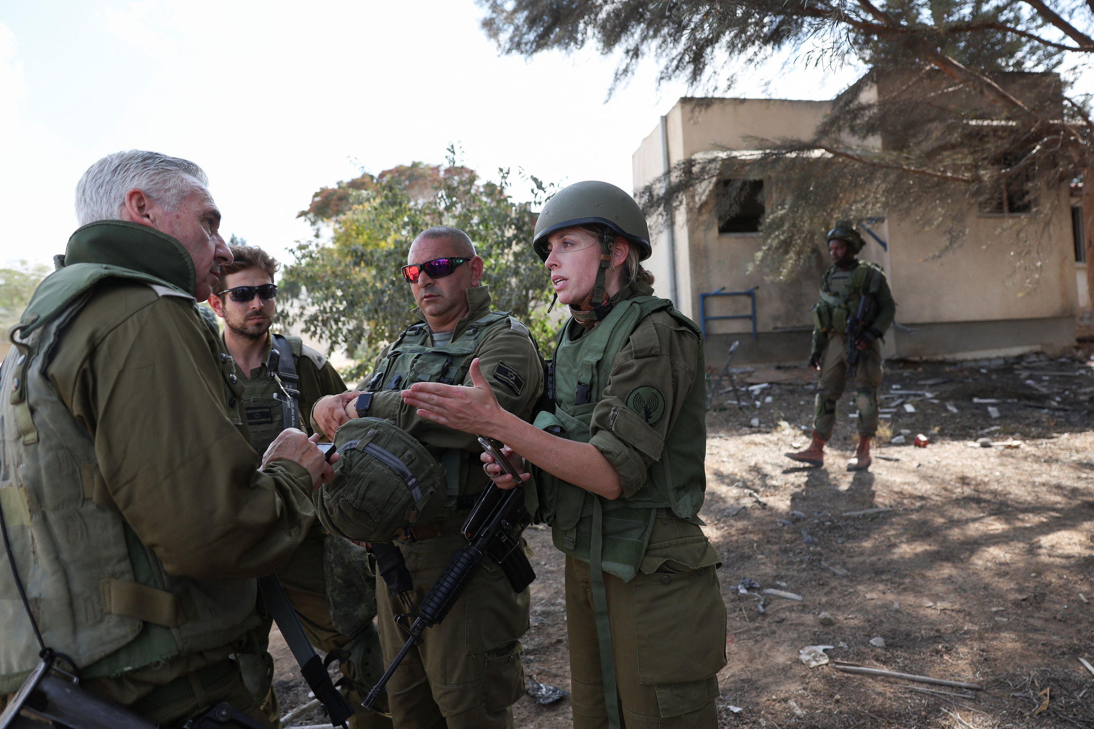 Μέλη των Ισραηλινών Αμυντικών Δυνάμεων μιλούν μεταξύ τους, μετά την επίθεση της Χαμάς από τη Λωρίδα της Γάζας, στο Κιμπούτς Κφαρ Άζα, στο νότιο Ισραήλ, 18 Οκτωβρίου 2023. (REUTERS/Violeta Santos Moura)