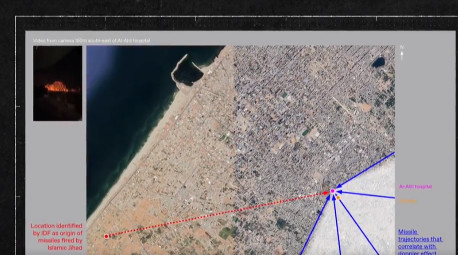 Στην συνέχεια, το βίντεο επικαλείται την ανάλυση του Forensic Architecture το οποίο αναφέρει ότι η τρισδιάστατη ανάλυση των ακτινικών θραυσμάτων δεν ταιριάζει με τον ισχυρισμό του Ισραήλ ότι μια λανθασμένη πυροδότηση παλαιστινιακής ρουκέτας με κατεύθυνση από δυτικά προς ανατολικά θα μπορούσε να έχει πλήξει το ιατρικό συγκρότημα.
