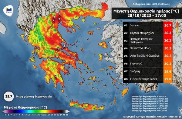 Σήμερα Κυριακή (29/10) ο υδράργυρος άγγιξε ως και τους 28 βαθμούς Κελσίου, κατά τόπους υψηλότερη κατά 1-2 βαθμούς, ενώ χαρακτηριστικό είναι ότι το Σάββατο της 28ης Οκτωβρίου σε έξι περιοχές «χτύπησε» 30άρια, με την υψηλότερη θερμοκρασία στους 30,7 βαθμούς Κελσίου στην Ιστιαία.