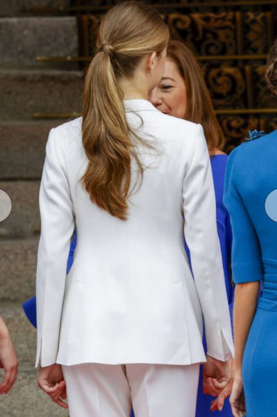 Η πριγκίπισσα Λεονόρ επέλεξε για την ιδιαίτερη περίσταση ένα κομψό λευκό κουστούμι που συνδύασε με μυτερές γόβες. Είχε πιασμένα τα μαλλιά της σε μια απλή χαμηλή αλογοουρά και τόνισε τα χαρακτηριστικά της με μάσκαρα κι ένα ροζ κραγιόν.
