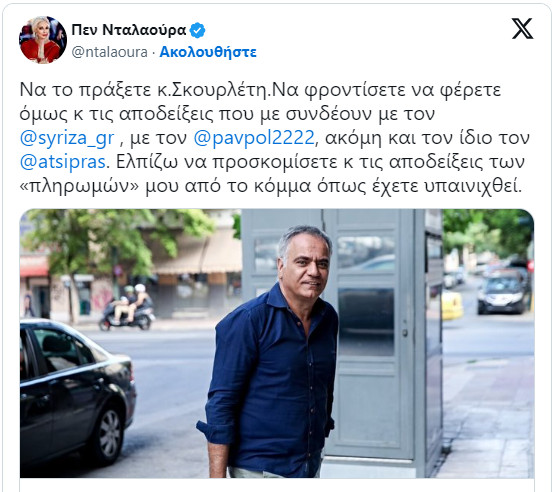 Ο πρώην υπουργός Πάνος Σκουρλέτης -με αιχμή τις εσωκομματικές στον ΣΥΡΙΖΑ -είχε μιλήσει πρόσφατα για «παράκεντρα» και «υπόγεια με στημένο μηχανισμό». Έκανε λόγο για δημοσιογράφους οι οποίοι που δούλευαν σαν τρολ του Τσίπρα, και οι καταγγελίες είχαν αποτέλεσμα οι λογαριασμοί, όπως το «Πεν Νταλαούρα», να απαντούν σε έντονο τόνο. «Και τώρα οι δυο μας και πάλι τρελό αγόρι», είναι η επίμαχη ανάρτηση στον λογαριασμό «Πεν Νταλαούρα» προς τον Πάνο Σκουρλέτη, όπου συνοδεύεται με μια φωτογραφία με κέντρο της τον πρώην υπουργό του ΣΥΡΙΖΑ.