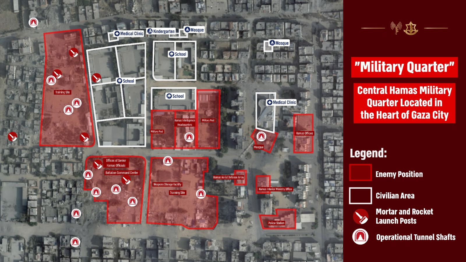 «Πρόκειται για στρατιωτική συνοικία, που είναι η καρδιά των επιχειρησιακών δραστηριοτήτων της Χαμάς. Χρησιμοποιήθηκε, μεταξύ άλλων, για τον σχεδιασμό και την προετοιμασία της επίθεσης της 7ης Οκτωβρίου. Κατά τη διάρκεια των τελευταίων ημερών, δυνάμεις πεζικού, μηχανικού και τεθωρακισμένων υπό τη διοίκηση της Ταξιαρχίας Givati εργάστηκαν για την εκκαθάριση της περιοχής και την εξουδετέρωση των υποδομών, συμπεριλαμβανομένου ενός εκτεταμένου δικτύου υπόγειων σηράγγων», ανέφεραν οι IDF, αφού κατέλαβαν το αρχηγείο.