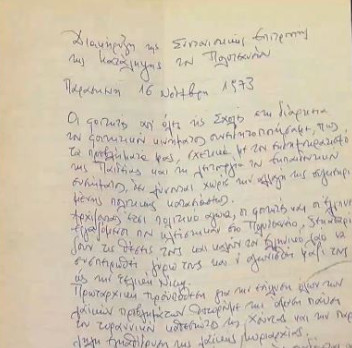 Στο στούτιο της ΕΡΤ η γνωστή καθηγήτρια είχε μαζί της και τη διακήρυξη, που είχε μείνει στο ταγάρι της, την είχε γράψει καθαρά για να τη διαβάσει στους δημοσιογράφους που βρίσκονταν στο σημείο και τώρα θα το δωρίσει στον Πρύτανη του Πολυτεχνείου.