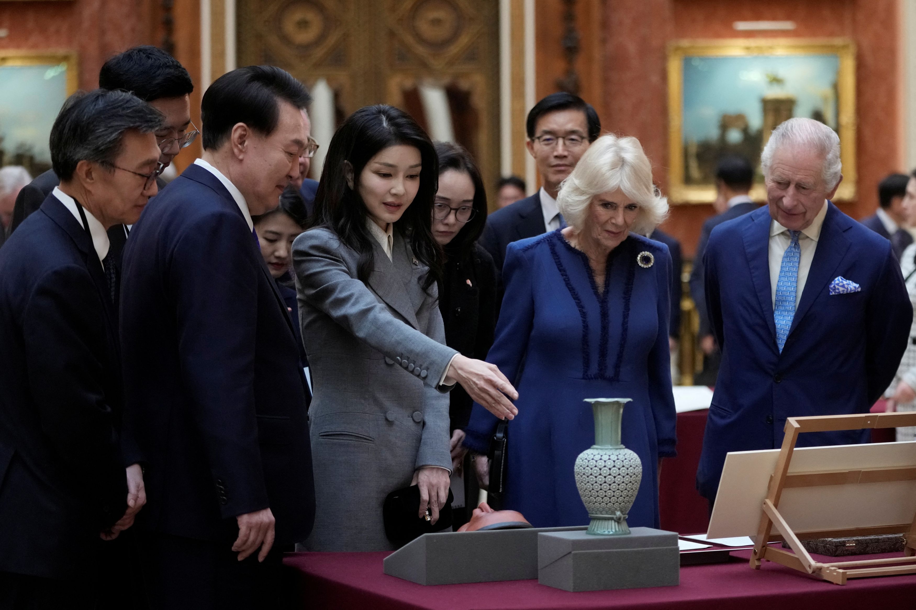 Ελληνικό χρώμα είχε η υποδοχή του προέδρου της Νότιας Κορέας από τον βασιλιά Κάρολο, καθώς ο Βρετανός γαλαζοαίματος επέλεξε για την περίσταση να φορέσει γραβάτα με μικρές ελληνικές σημαίες, όπως φαίνεται στις φωτογραφίες που ακολουθούν.