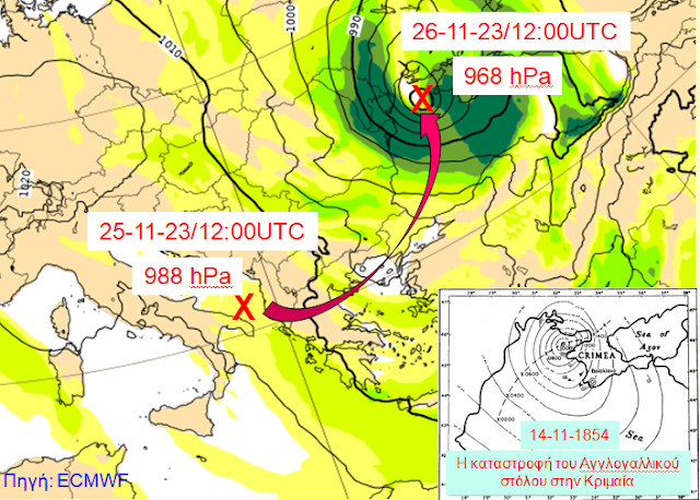 Αυτό που με εξιτάρει περισσότερο στην επικείμενη κακοκαιρία είναι η εκρηκτική κυκλογένεση στη Μαύρη Θάλασσα που μου έφερε στο νου την καταστροφή του Αγγλογαλλικού στόλου τον Νοέμβριο του 1854. Παλαιότερα είχα γράψει ότι τότε η πίεση στο κέντρο του χαμηλού είχε πέσει στα 993,5 hPa. Τώρα, η πίεση θα πέσει πολύ πιο κάτω και είναι λογικό να προβλέψει κάποιος περισσότερες καταστροφές, αλλά ας μην ξεχνάμε ότι στις μέρες μας πολλά πράγματα (υποδομές, πλοία κ.λπ.) είναι ανθεκτικότερα.